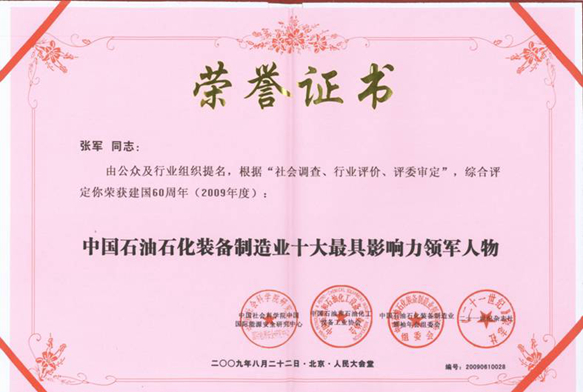 董事長張軍榮獲“2009中國石油石化裝備制造業(yè)十大最具影響力領軍人物”