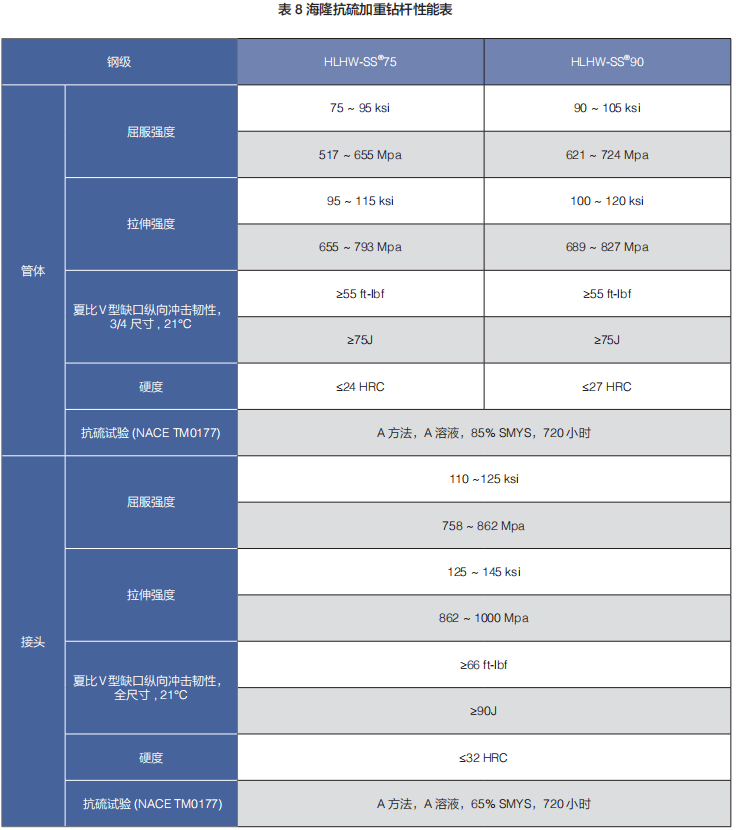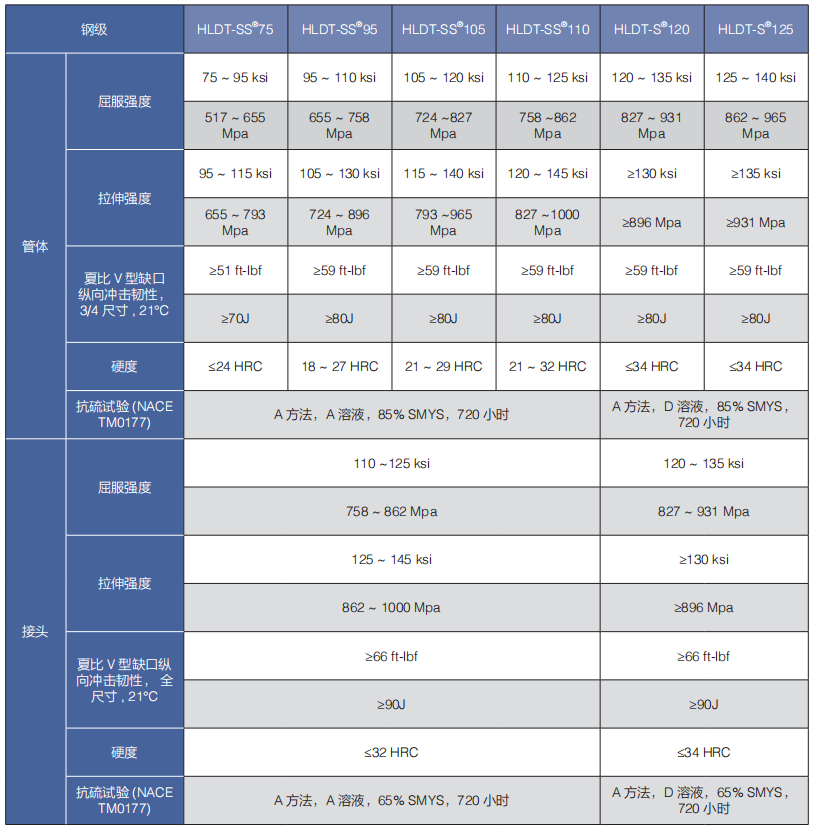 (b)海隆抗硫鉆桿鋼級:HLDT-SS®75、HLDT-SS®95、HLDT-SS®105、HLDT-SS®110、HLDT-S®120、HLDT-S®125。