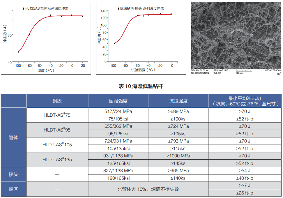 和普通鉆桿相比,該產品具有更好的低溫韌性,包括更高的沖擊功和更低的韌脆轉變溫度,具有更優的抗脆斷能力。如在常溫使用,具有比普通鉆桿更高的抗斷裂和疲勞能力,使用壽命可顯著提高。